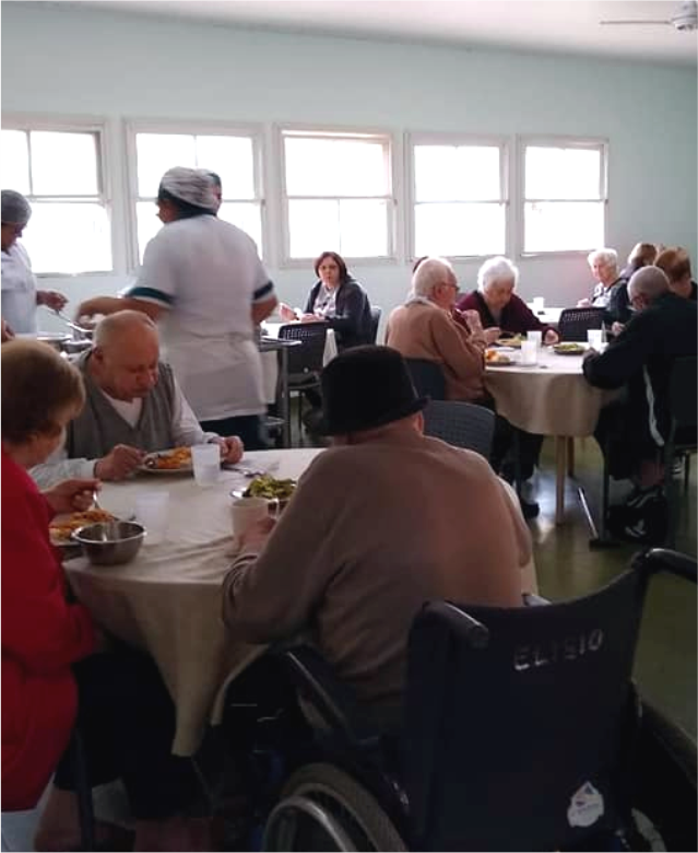 O refeitório é um local de encontro diário, onde as refeições são servidas conforme o cardápio e horários previstos. Assim é possível estabelecer uma rotina diária para servir o café da manhã, lanches, almoço, jantar, banho e demais atividades com profissionais de diferentes áreas.